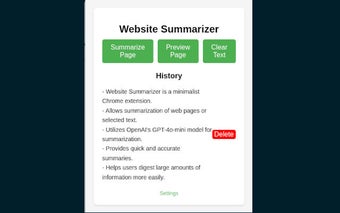 ウェブサイト要約ツールの主な機能には、ウェブページ全体または特定のテキスト選択を要約する機能、要約を最終決定する前に確認するためのプレビュー機能、最後の10件の要約を保持する履歴機能が含まれています。ユーザーは履歴アイテムを展開または折りたたむことで要約を簡単に管理し、不要なエントリを削除できます。さらに、この拡張機能はOpenAI APIキーを管理するためのユーザーフレンドリーな設定ページを提供し、全体的なユーザーエクスペリエンスを向上させます。